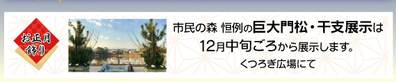 枚方市「市民の森 鏡伝池」恒例の巨大門松・干支の展示が行われます。